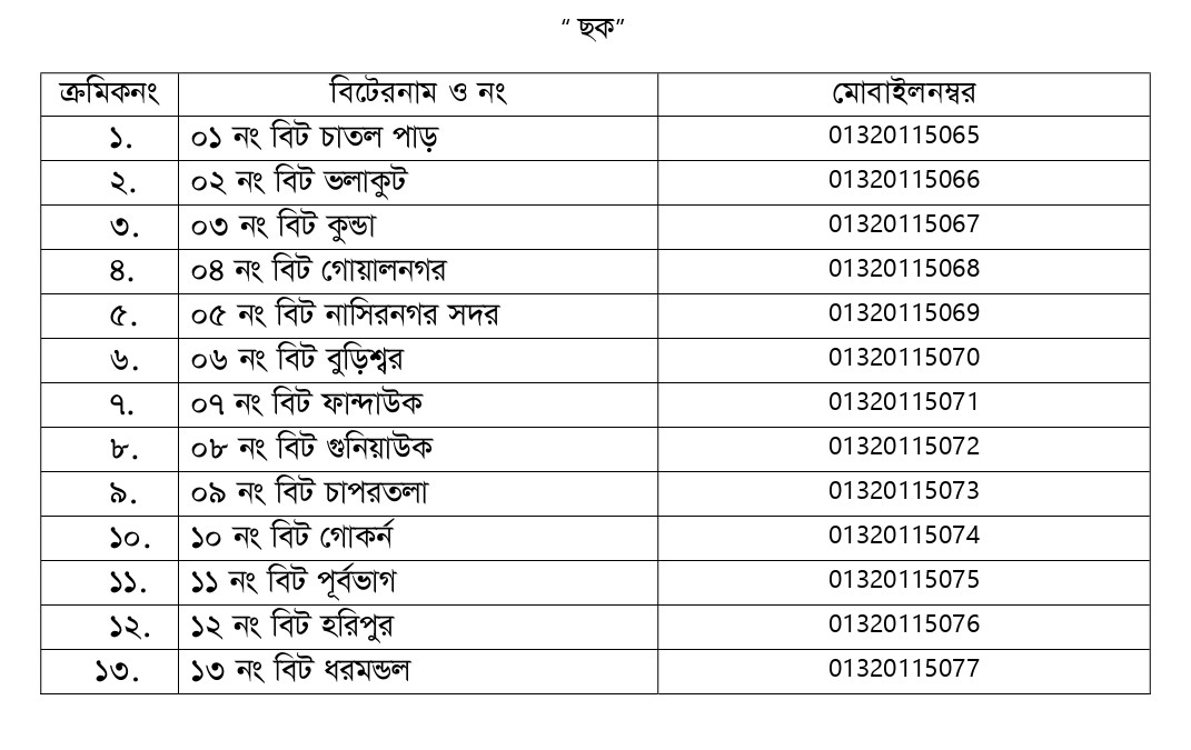 নাসিরনগর থানাধীন বিটে দায়িত্বরত অফিসারের মোবাইল নম্বর নিম্নে ছক দেওয়া হইলঃ